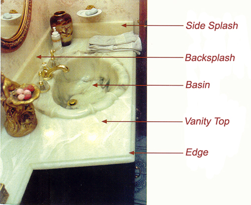left. Edges can be molded flush or as an Ogee edge(as pictured here). Vanity tops are molded with a thickness of .75" Backsplash's are seamlessly molded into top.
